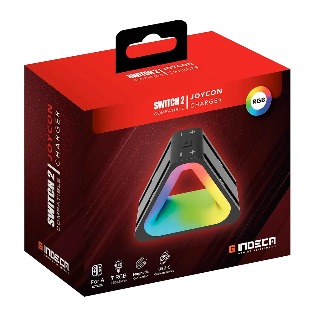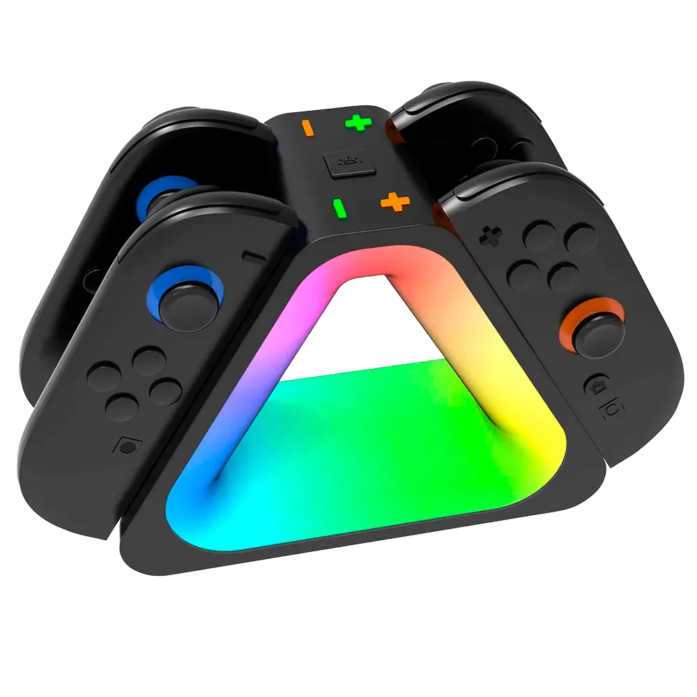 La base de carga triangular está pensada para jugadores que buscan practicidad y estilo en su setup. Permite cargar hasta 4 Joy-Con de manera simultánea, con un sistema de carga magnética que asegura una conexión rápida y segura. Su diseño compacto y estable con iluminación RGB dinámica le da un aspecto gamer único, mientras mantiene tus mandos siempre organizados y listos para jugar. Cuenta con indicadores LED individuales en cada ranura para mostrar el estado de carga de cada control. Con conexión USB-C y protección contra sobrecarga y sobrecalentamiento, es un accesorio confiable y duradero. Compatible con Nintendo Switch 2 Joy-Con.